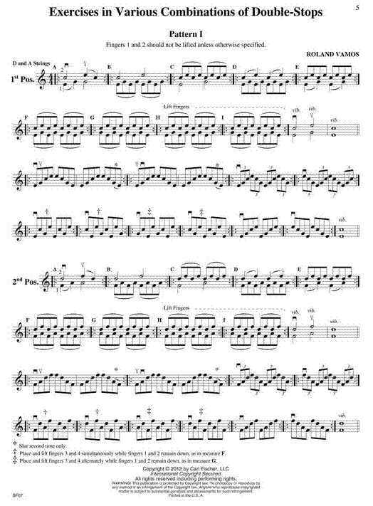 The most direct way to describe the essence of the concept and benefits of these exercises for the aspiring violinist is to simply quote one of its students, as well as the creator himself. From Rachel Barton Pine: 'Vamos's double-stop exercises fill a void in the literature of technical exercises for violinists and violists. Today there are many classic books with thirds, sixths, octaves, etc., by such composers as Schradieck, Ševcik, Flesch, and Dounis. However, none of these wonderful collections features a systematic series of fixed double-stops that enables the aspiring violinist or violist to practice and master every possible combination of finger patterns across two strings without shifting.”