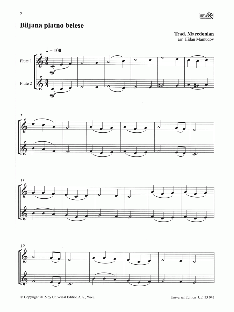 Zusatzinfo/Inhalt Western Europe discovered the music of the Balkans in the 1990s, and it remains popular today. Universal Edition now publishes a range of books in their Balkan series for instrumental solos with piano and CD, along with a flexible ensemble arrangement, allowing a mix-and-match approach to instrumentation. Now Mamudov has arranged ten melodies from the region from Hungary to Turkey, Romania to Greece, in progressive difficulty for two flutes, from intermediate to advanced levels. Add new sounds and rhythms to your repertoire, as you explore this fascinating region.