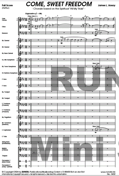 Zusatzinfo/Inhalt „Come, Sweet Freedom“ basiert auf dem Volkslied „All My Trials“. Die Ursprünge des vor allem in Afrika und Amerika bekannten Traditionals sind unklar, aufgrund seines biblisch-religiösen Inhalts ordnete man es jedoch der Gruppe der Spirituals zu. Der Text beschreibt die harte Realität der Sklaverei und sieht im Tod den einzigen Ausweg aus Knechtschaft und Leiden, hin zu Frieden und Freiheit. In der bekanntesten Strophe des Liedes singt eine Mutter für ihr kleines Kind: „Hush little baby, don’t you cry. You know your mama's bound to die. All my trials, Lord, soon will be over.“ („Beruhige Dich, mein Baby, weine nicht. Du weißt, dass deine Mama sterben muss. All meine Plagen, Herr, werden bald vorüber sein.“) Ausgehend von dieser eindringlichen Botschaft wählte der amerikanische Komponist James L. Hosay für seine ganz persönliche, bewegende Vertonung des bekannten Klassikers den Titel „Come, Sweet Freedom“. Dabei ist das Stück weit mehr als eine reine Bearbeitung. Ausgehend von einem Zwiegespräch zwischen Oboe und Klarinette entwickelt Hosay eine ergreifende Choral-Fantasie, die die sowohl zutiefst traurige als auch hoffnungsvolle Botschaft der Musik auf besondere Art und Weise zum Ausdruck bringt.