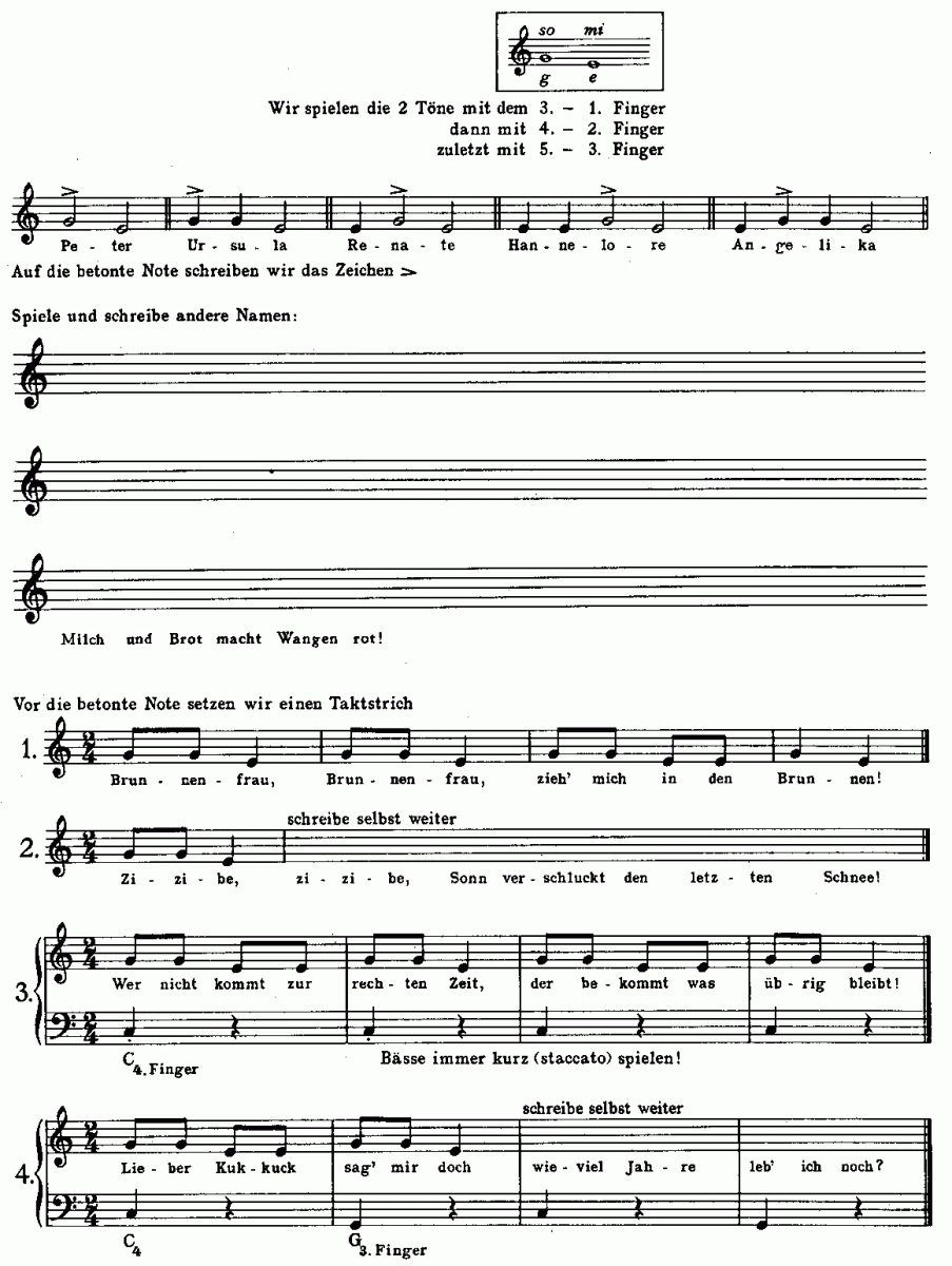 Diese im Auftrag der Jugendmusikschule München herausgegebene Spielheft ist zu jeder Akkordeonschule verwendbar; es will eine Verbindung zwischen elementarem Singunterricht und dem Anfangsunterricht auf dem Akkordeon herstellen.Die gehörmässige Erarbeitung des Tonraumes gelangt von der Rufterz über die Pentatonik bis zur Tonleiter. Das unterlegte Wort sowie die Transposition in andere Tonstufen werden von Anfang an einbezogen.Die Pnetatonik erlaubt das mehrstimmige Zusammenspiel mit ostinaten Bässen und ähnlichen Begleitformen.
